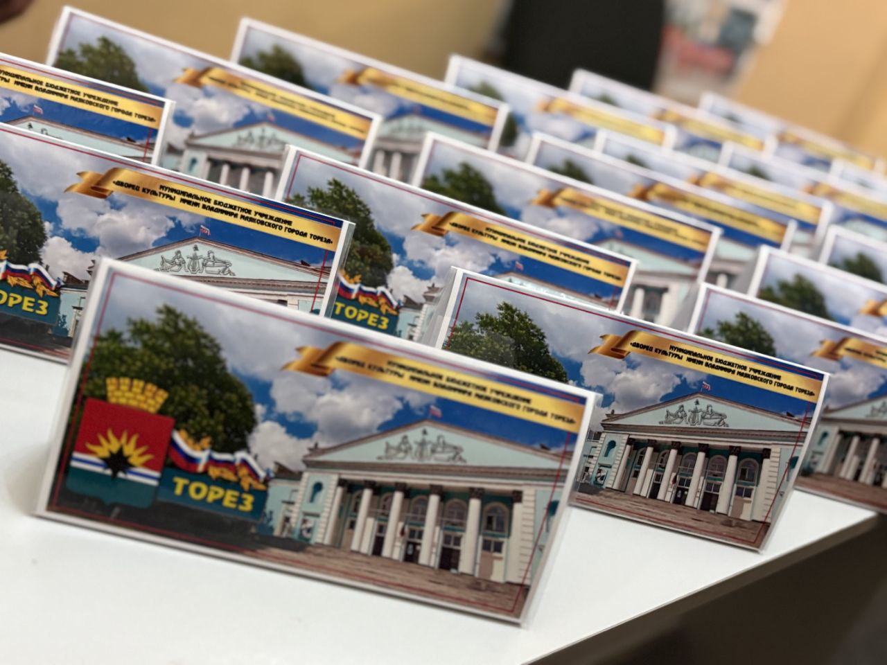 В результате получился уникальный и информативный настольный календарь - домик с фотографией - брендом Дворца культуры имени Владимира Маяковского, патриотической символикой и гербом городского округа Торез.