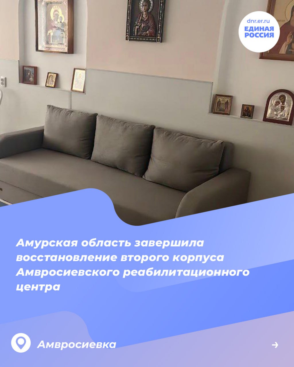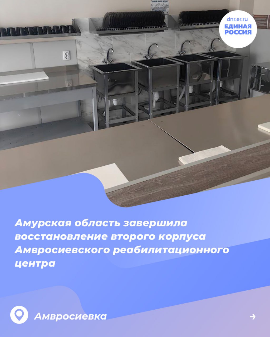 К концу 2025 года было завершено полное восстановление второго корпуса Амвросиевского реабилитационного центра, осуществлённое при поддержке Амурской области по программе «Возрождаем Донбасс Вместе» при содействии народной программы Единой России.
