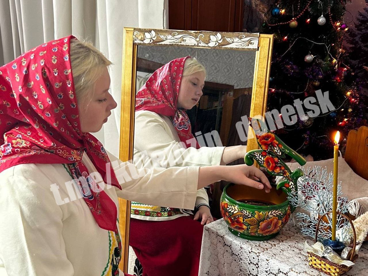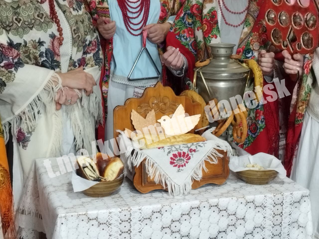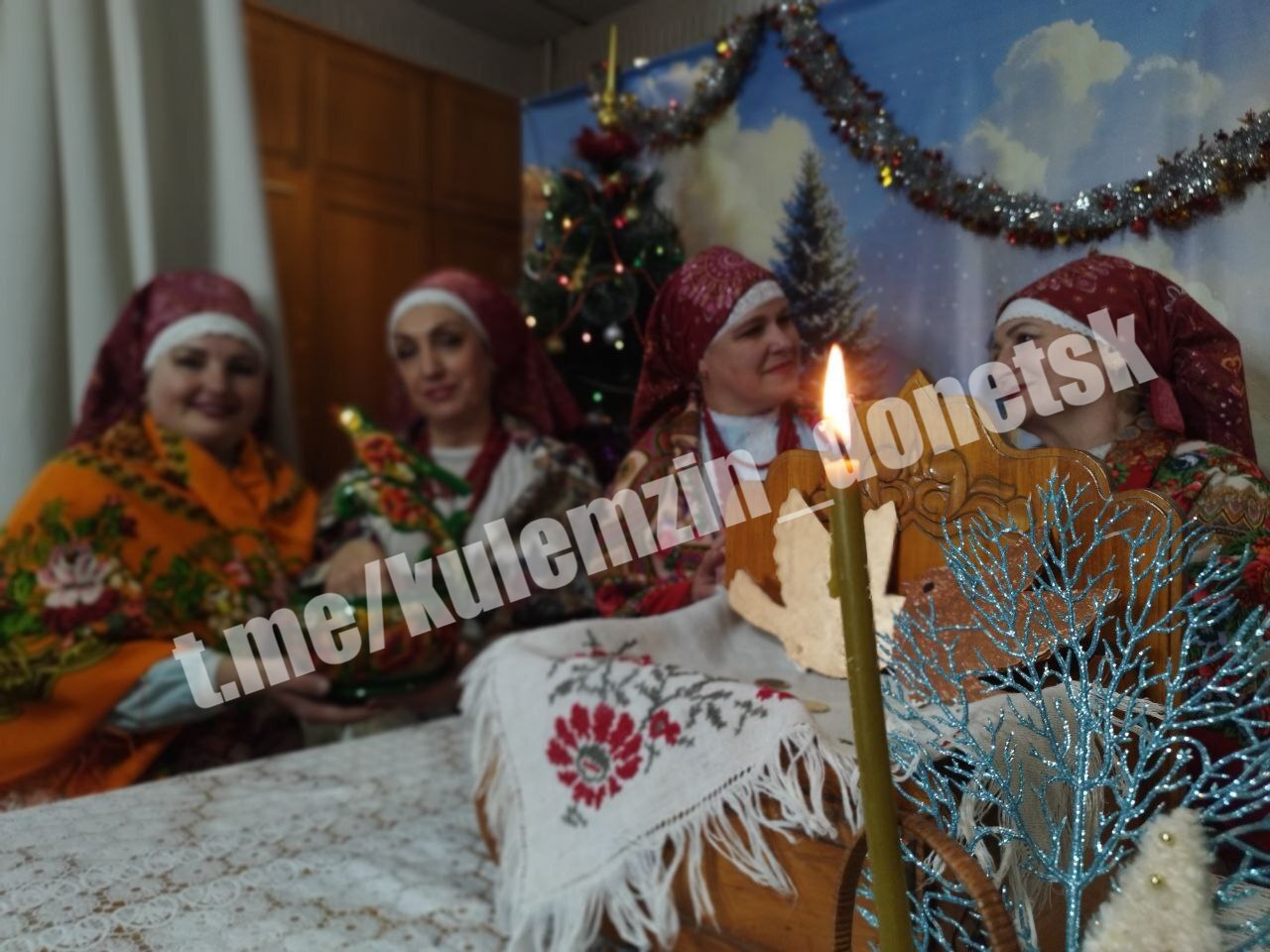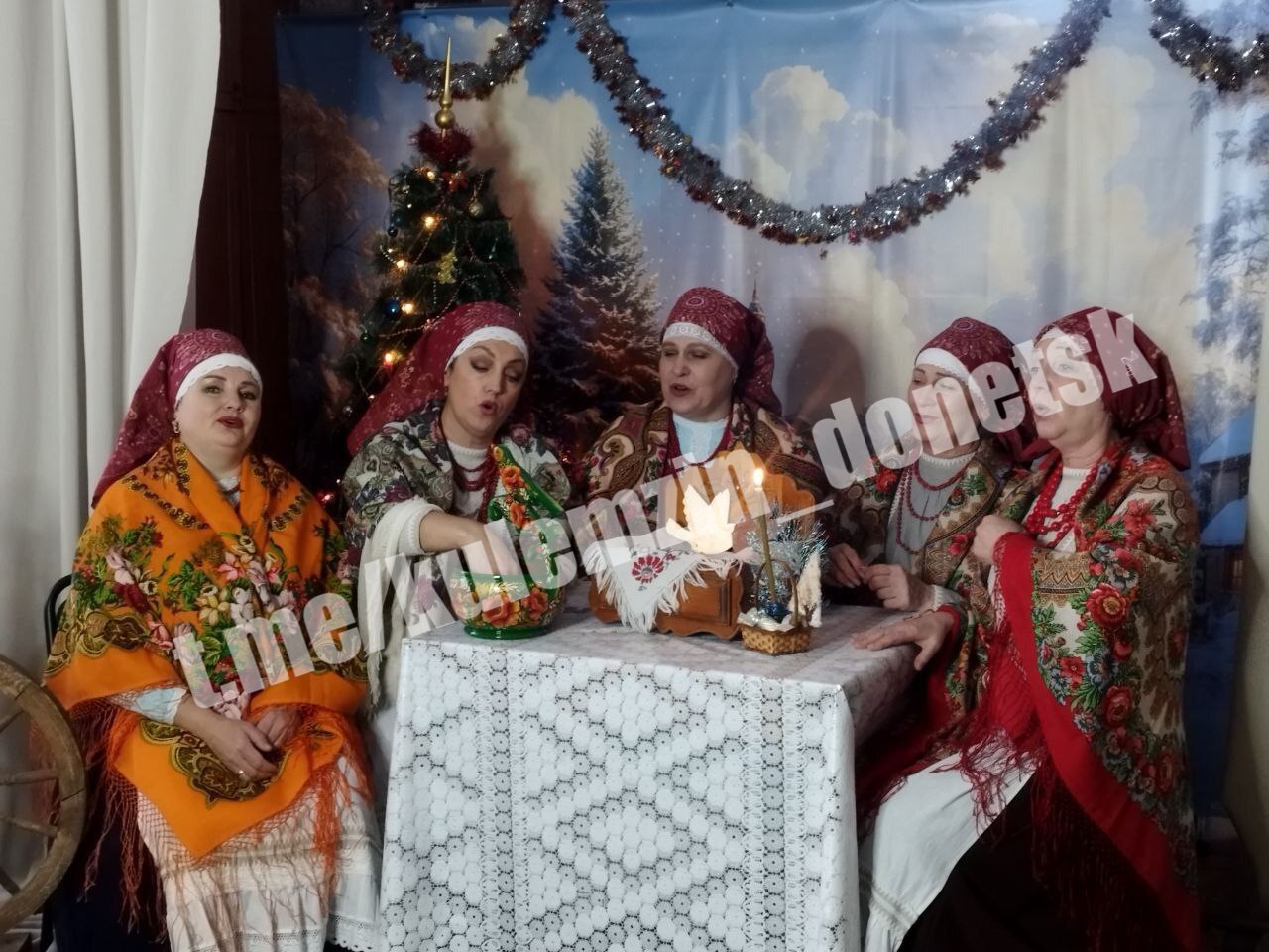 Под аккомпанемент баяна и гармони участницы ансамбля накрыли традиционный стол с сочивом, чаем и пирогами, пели крещенские обрядовые песни и гадали на будущее.