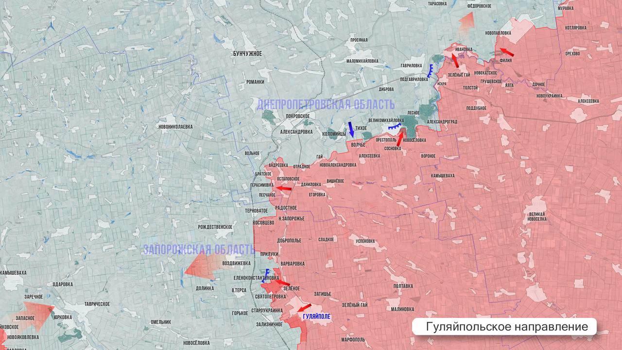 На Гуляйпольском направлении ВС РФ отбили 5 контратак ВСУ и продвинулись на отдельных участках до 500 м в сторону Зализничного. После освобождения Прилук наши войска начали пробиваться в сторону Воздвижевки и расширять подконтрольную территорию южнее Терноватого. На северном фланге этого участка продолжаются встречные бои в районе Братского.