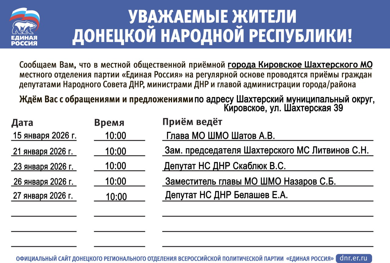 График приема граждан в общественной приемной города Кировское Шахтерского местного отделения партии «Единая Россия» в январе 2026 года