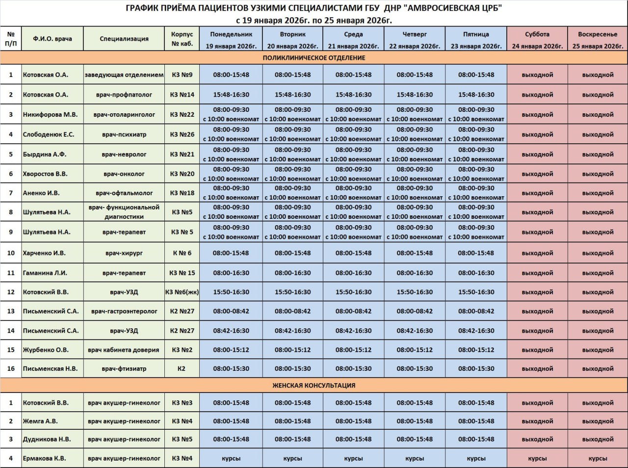 График приема врачей поликлинического отделения ГБУ ДНР "Амвросиевская ЦРБ". Для уточнения информации, обращайтесь в регистратуру по тел. +78565922310