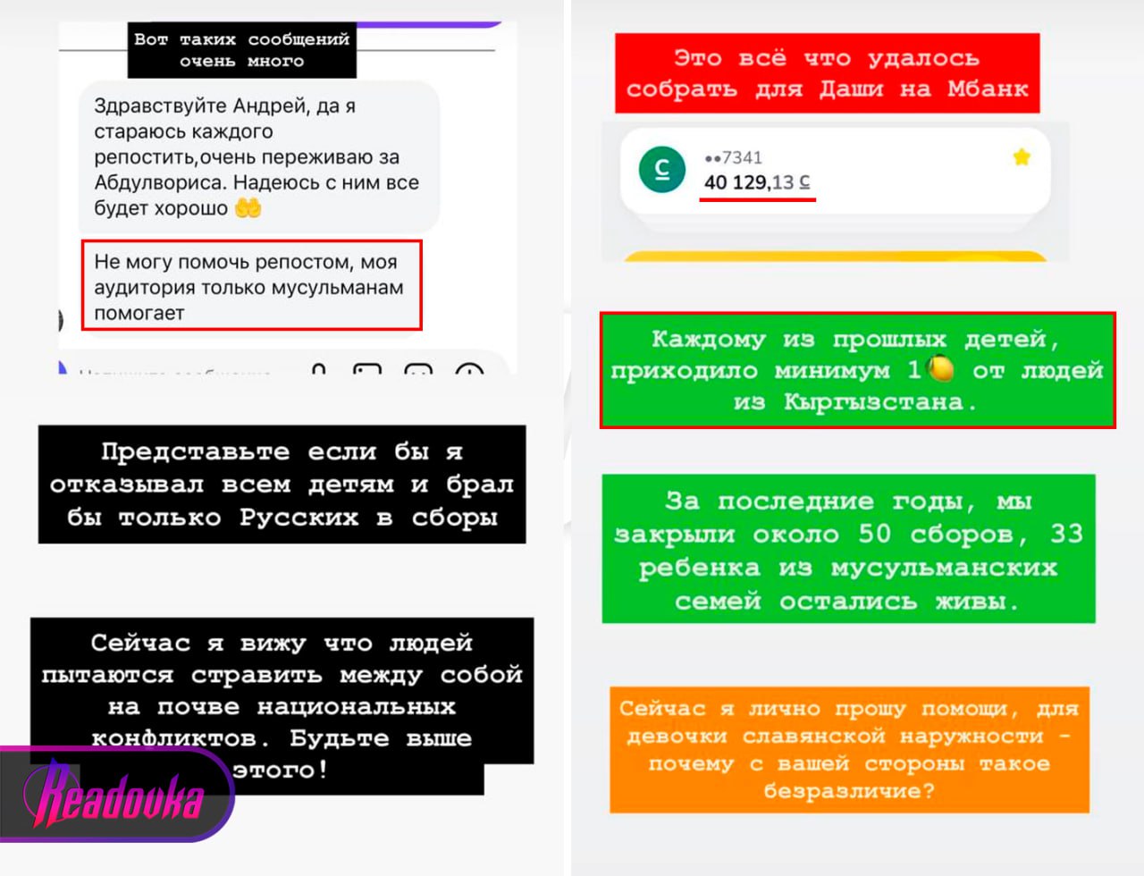 Волонтер Андрей Новиков спас 33 ребенка из мусульманских семей в Киргизии. Однако когда он опубликовал пост с просьбой помочь девочке Даше, удалось собрать лишь 35 тыс, тогда как в случае с детьми мусульман от жителей он получал минимум 900 тыс, пишет мужчина в соцсетях. На логичный вопрос от волонтера, в чем же дело, от части аудитории поступил ответ, что помогать они будут «только мусульманам».