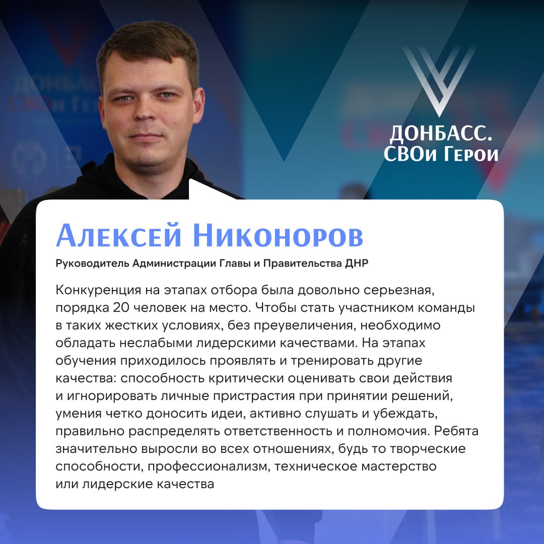 Участники образовательной программы «Донбасс. СВОи Герои» вместе с наставниками начали готовить свои проекты. Цель — предоставить собственное видение мер по улучшению качества жизни в регионе. А уже летом финалисты будут защищать свою работу перед комиссией, о чем рассказал Руководитель Администрации Главы и Правительства ДНР Алексей Никоноров.