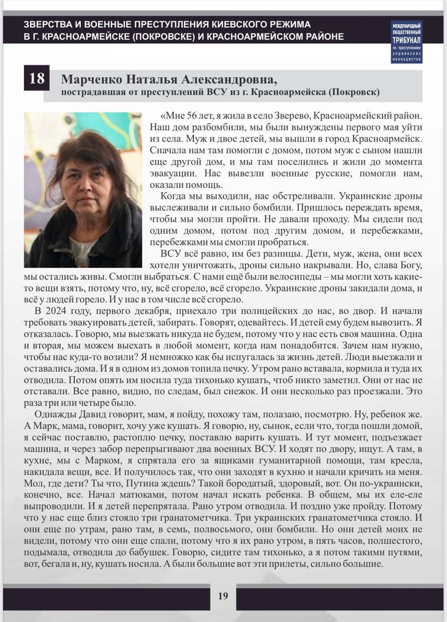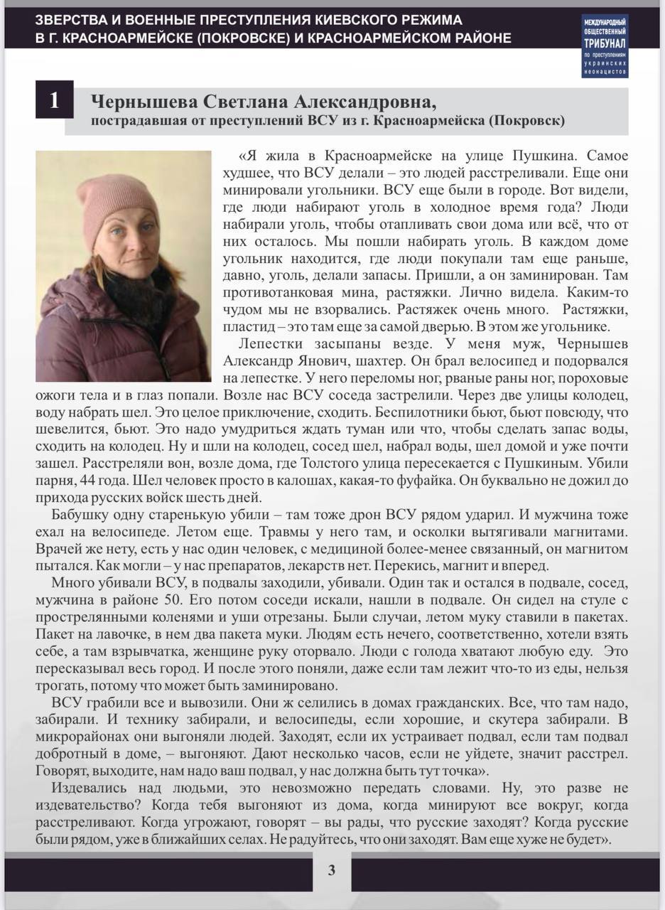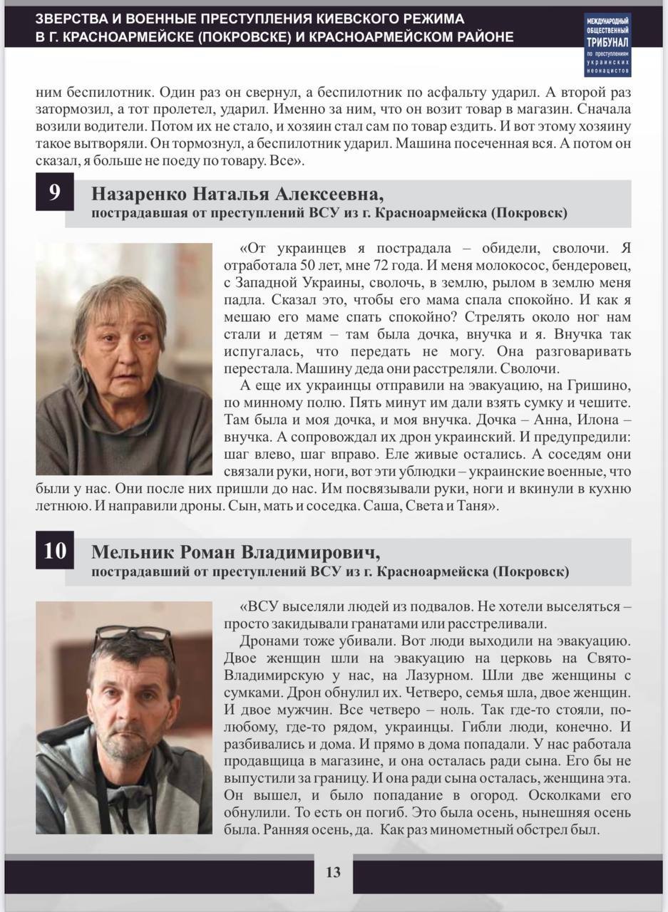 Представленные материалы свидетельствуют об украинских военных преступлениях, совершенных в период, когда Красноармейск (Покровск) находился под контролем Украины. Так же, как и в других населенных пунктах, находящихся под украинским контролем, Вооруженные силы Украины проводили политику геноцида русского населения.