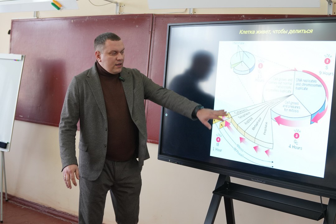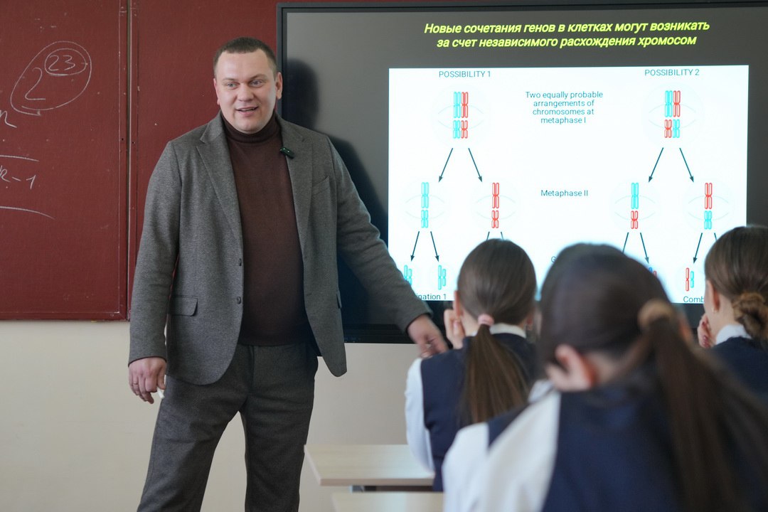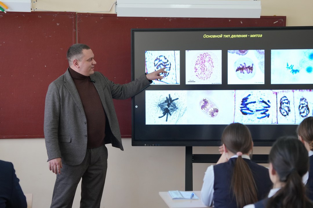 В гимназии имени Г.Т. Берегового состоялось четвертое занятие из цикла просветительских уроков «Основы генетики». С ребятами говорили о том, как распределяется генетическая информация в процессе клеточного деления.