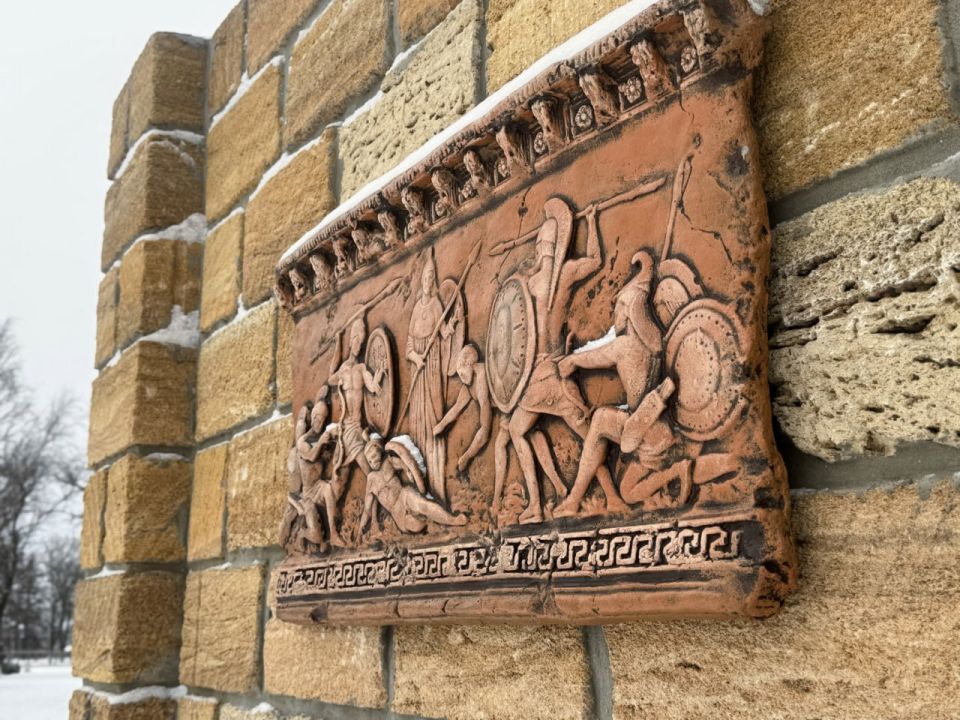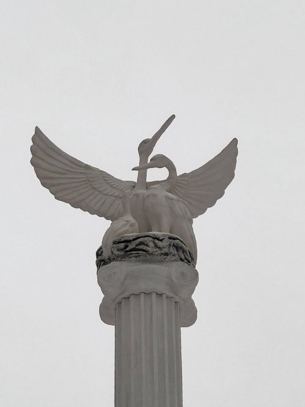 Здесь установлена изящная сцена-ракушка, напоминающая античный амфитеатр, белоснежные колонны с портиками в духе классической Эллады.Стела с тремя аистами олицетворяет семейные ценности. Она также напрямую отсылает к этимологии названия посёлка: «Мангуш» с греческого переводится как «белая птица».