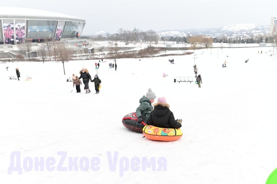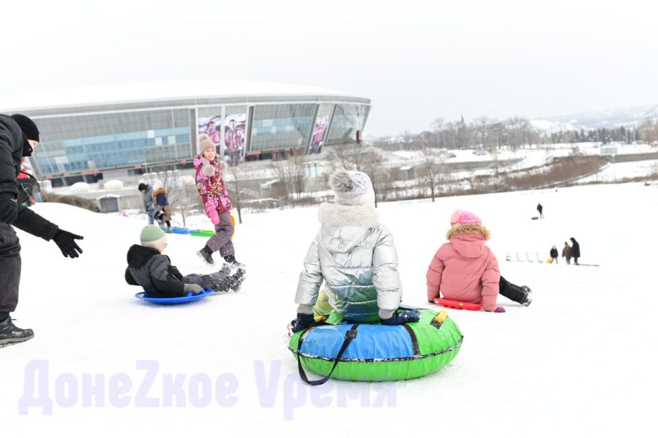 Нынешняя зима радует и детей, и взрослых. Вот уже которые выходные в сквере возле “Донбасс Арены” многолюдно. Дончане приходят сюда семьями, чтобы покататься с горки на “ватрушках”.