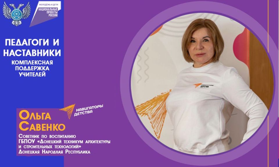 Ярким примером такого специалиста является Ольга Сергеевна Савенко, советник директора по воспитанию Донецкого техникума архитектуры и строительных технологий. В 2024 году она стала победителем регионального этапа III Всероссийской премии «Новая философия воспитания» и активным участником одноименного форума в 2024-2025 гг.