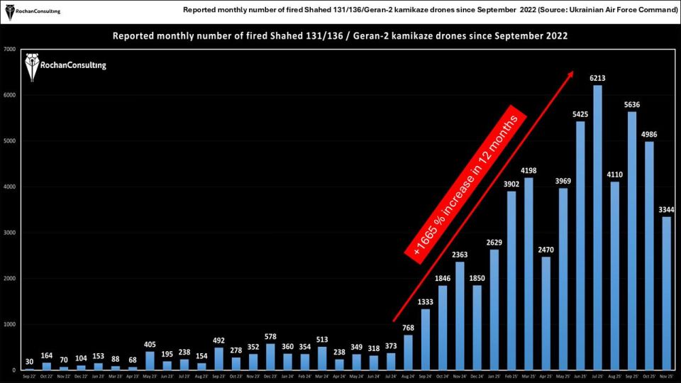 Эта эволюция обусловлена кардинальными изменениями в сфере дронов. После 1 июня 2025 года ежедневные объёмы применения оружия большой дальности выросли более чем в три раза, но почти весь прирост приходится на «Герани»: их средняя частота запуска увеличилась в четыре раза, и на их долю приходится примерно 96% всех средств поражения, выпущенных в период после «Паутины».