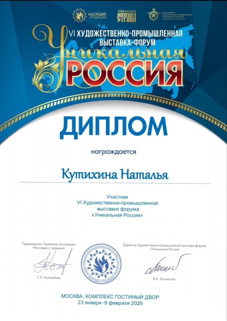 Работы Натальи Викторовны удостоены Диплома выставки-форума "Уникальная Россия".