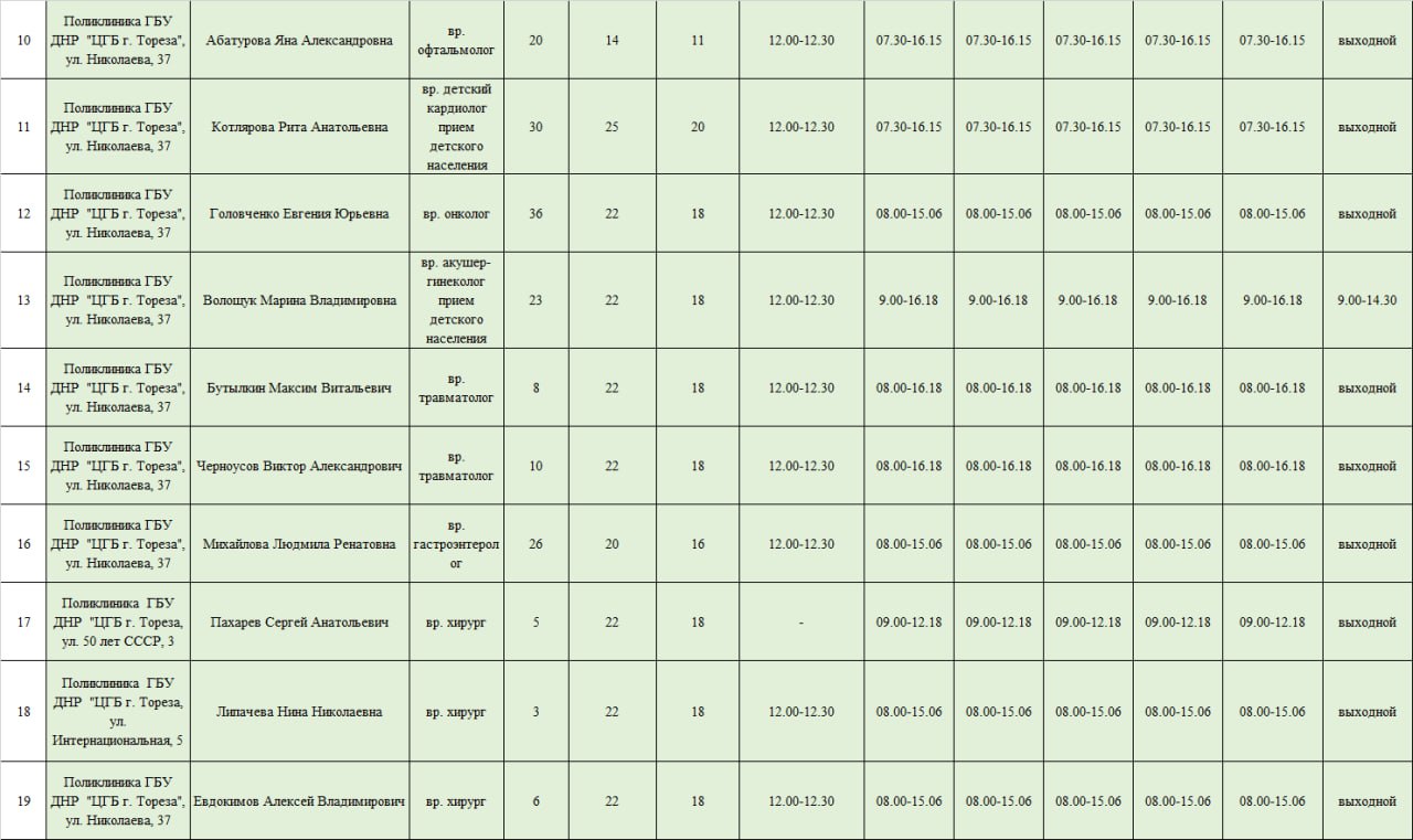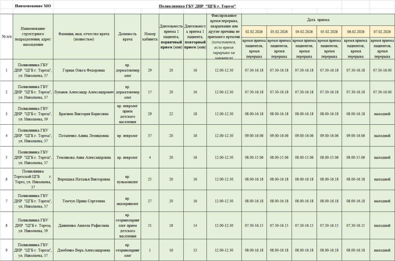 В рамках работы муниципального штаба по вопросам здравоохранения при администрации городского округа Торез, который был создан по поручению Главы ДНР Дениса Пушилина, администрация городского округа Торез информирует о графике приема пациентов врачами ГБУ ДНР "ЦГБ г.Тореза" с 02.02.2026- 07.02.2026.