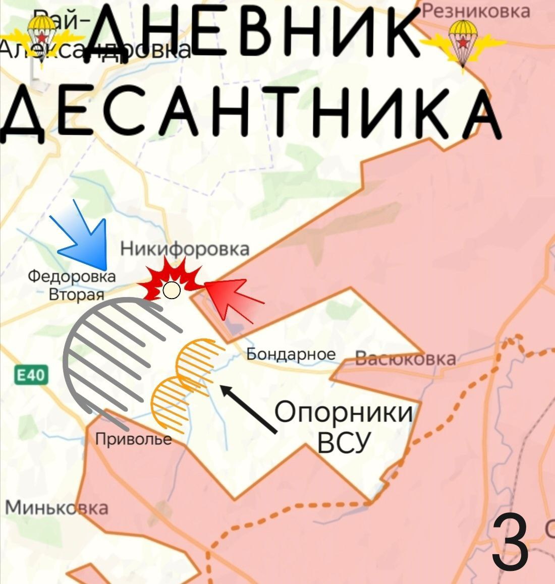 Ведутся активные бои за Никифоровку (карта 3), и прилегающие к ней лесополосы. Отсюда до лесополос, расположенных на южном охвате Федоровки Второй - "серая зона" с присутствием отдельных штурмовых групп ВС РФ. Пытаемся взять в окружение опорные пункты ВСУ, расположенные южнее, в "кармане" между Бондарным и Привольем.