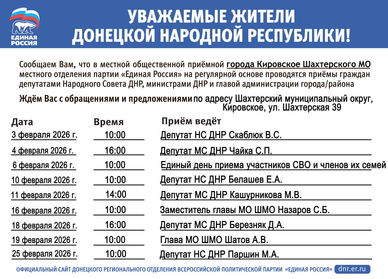 График приема граждан в общественной приемной города Кировское Шахтерского местного отделения партии «Единая Россия» в феврале 2026 года