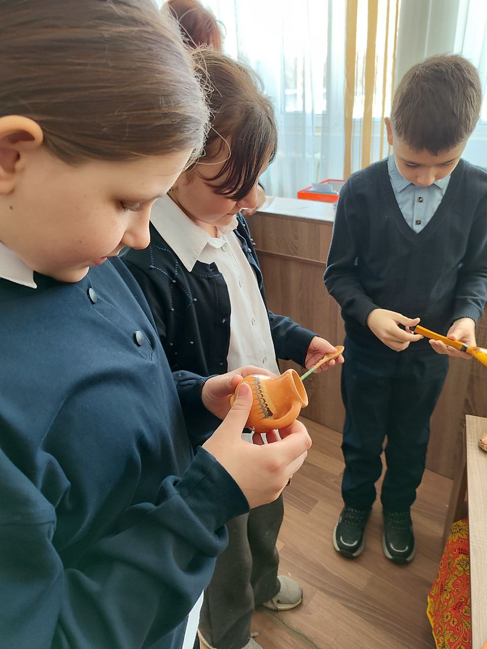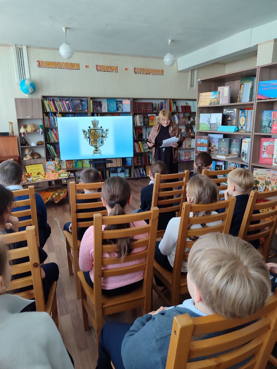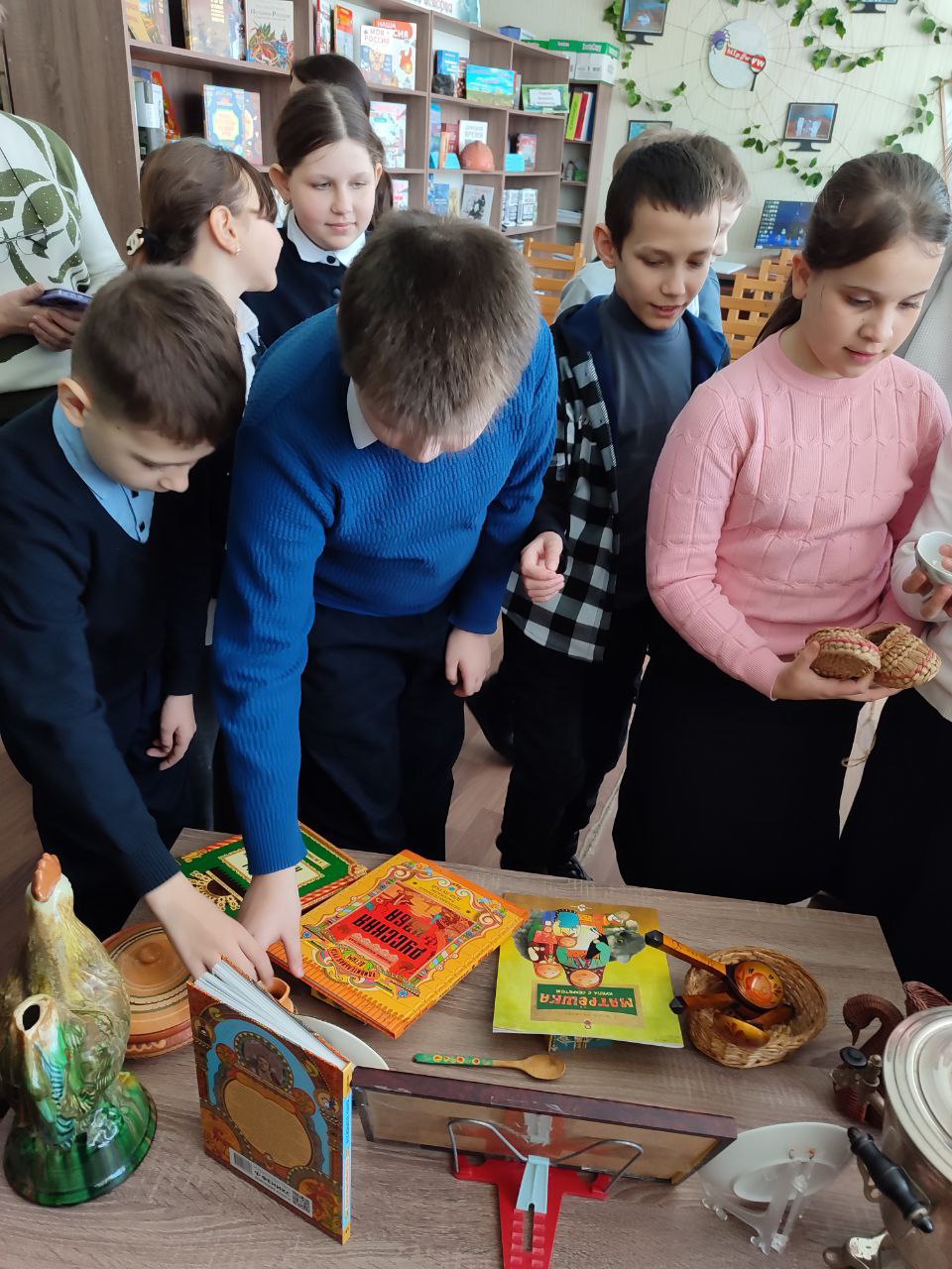 В ходе занятия библиотекарь представила информацию об истории ремёсел, сопровождая рассказ слайд-презентацией. Школьники познакомились с оренбургским пуховым промыслом, историей матрёшки, узнали об особенностях тульского самовара и значении валенок.
