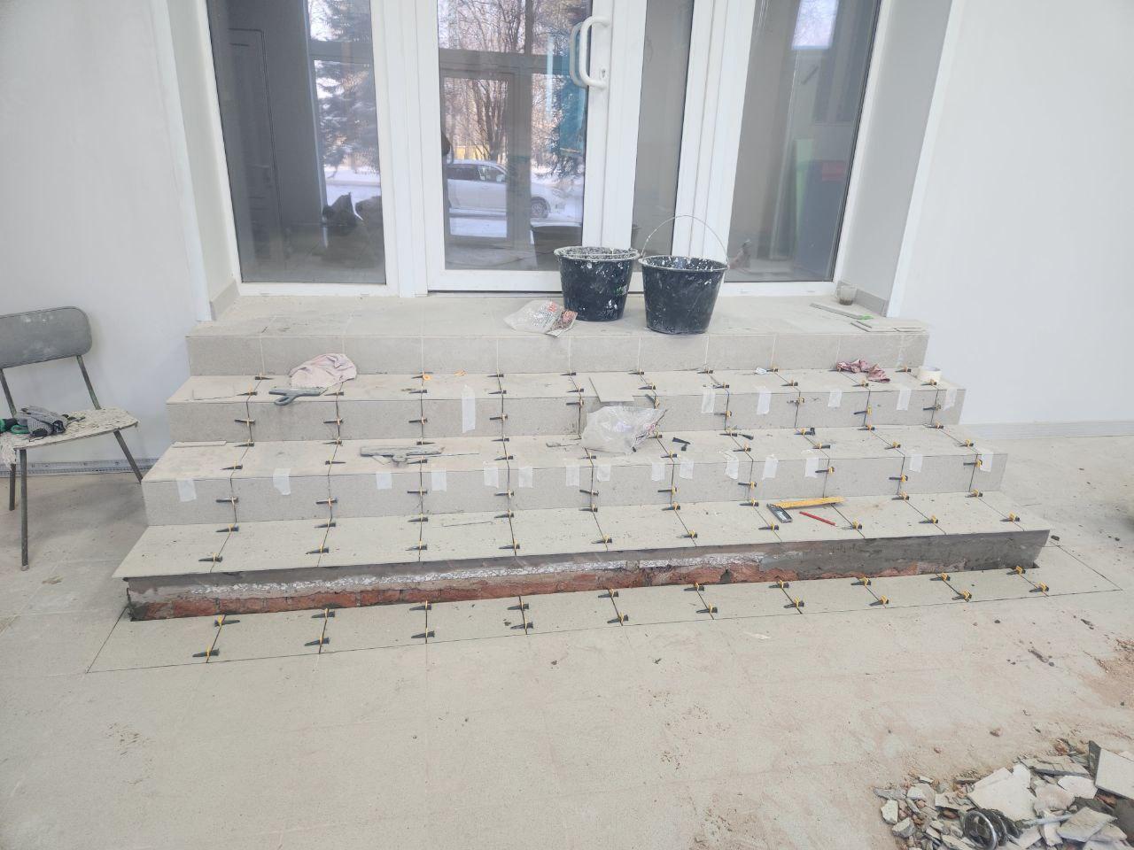Подрядчики региона-шефа доставили на объект необходимые строительные материалы и выполнили перекладку напольной плитки во входной зоне.