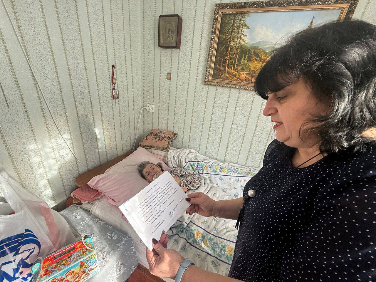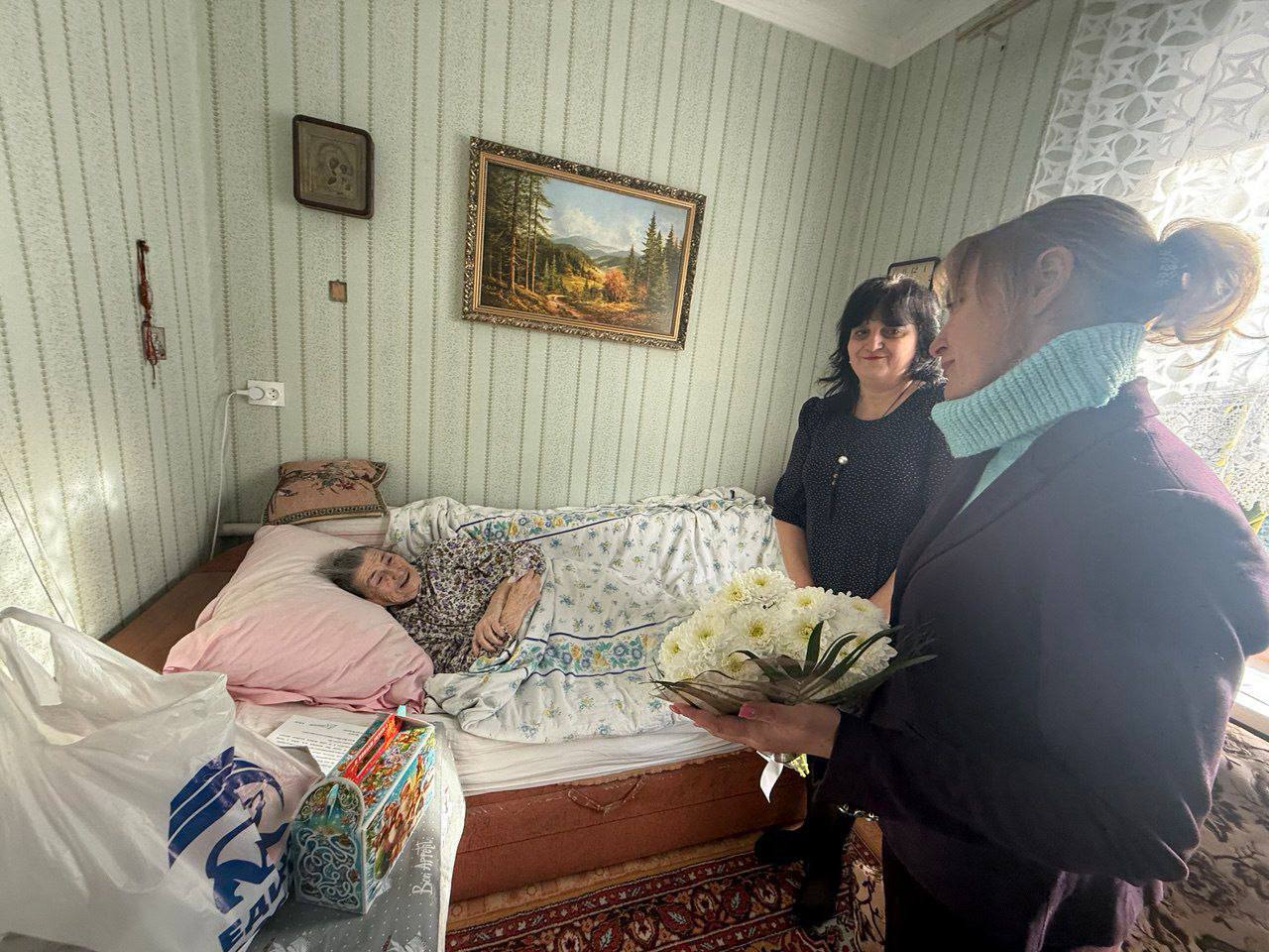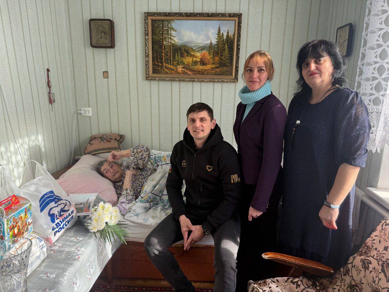 В рамках проекта «Старшее поколение» в гости к Ольге Павловне Титишевой — участнице Великой Отечественной войны, отмечающей свое 99-летие, пришли исполнительный Секретарь местного отделения Единой России, заместитель Главы Администрации Мангушского муниципального округа Наталья Тосхопаран, председатель совета женщин округа Алёна Никулина и представитель активной молодежи Руслан Пономаренко.