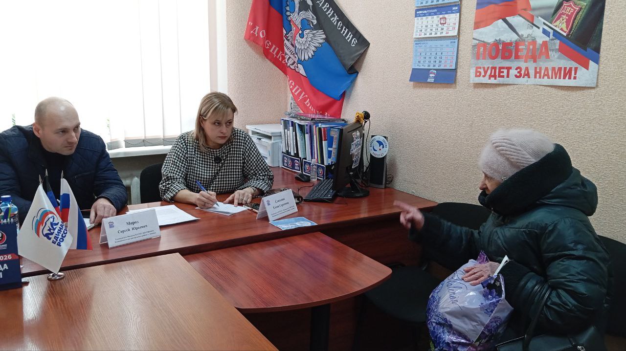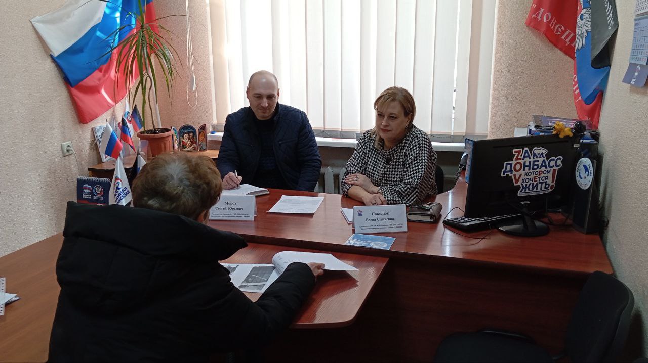 Руководитель ОСЗН №1 - Филиала ГБУ ДНР РЦСЗН Калининского района г. Донецка Елена Соколюк и руководитель Филиала №1 ГБУ ДНР РЦПМСП Калининского района г. Донецка Сергей Мороз провёли приём граждан в рамках работы общественной приёмной партии «Единая Россия» в Калининском внутригородском районе города Донецка.