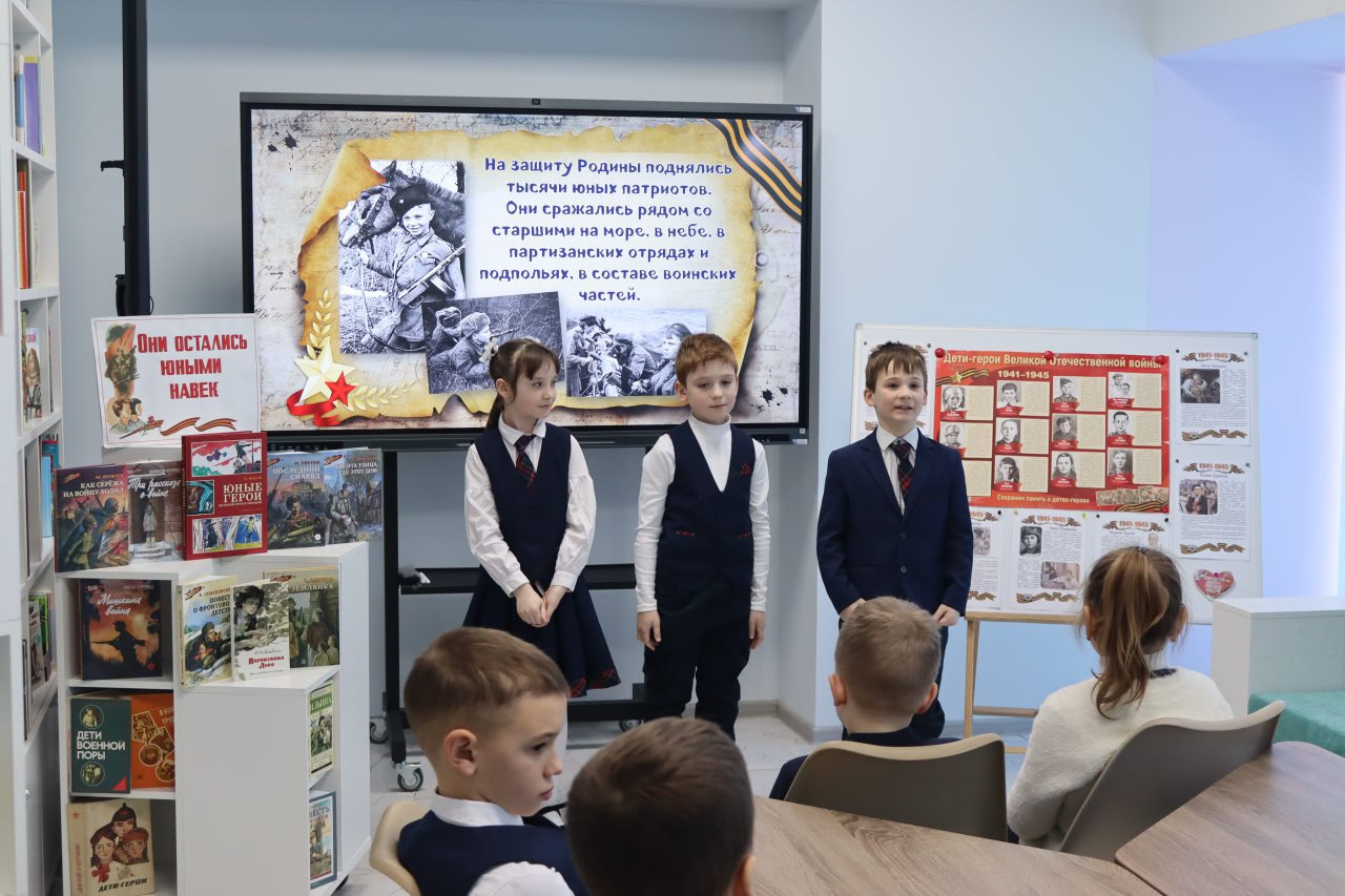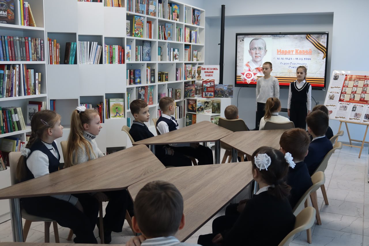 Библиотекари рассказали ребятам об истории создания этой памятной даты, о мальчишках и девчонках, которые за подвиги, совершённые в годы Великой Отечественной войны, были удостоены самой высокой награды Родины — звания Героя Советского Союза. Школьники с интересом слушали рассказ о своих ровесниках: Лёне Голикове, Зине Портновой, Марате Казее, Вале Котике и других пионерах-героях, чей подвиг навеки останется в памяти поколений.