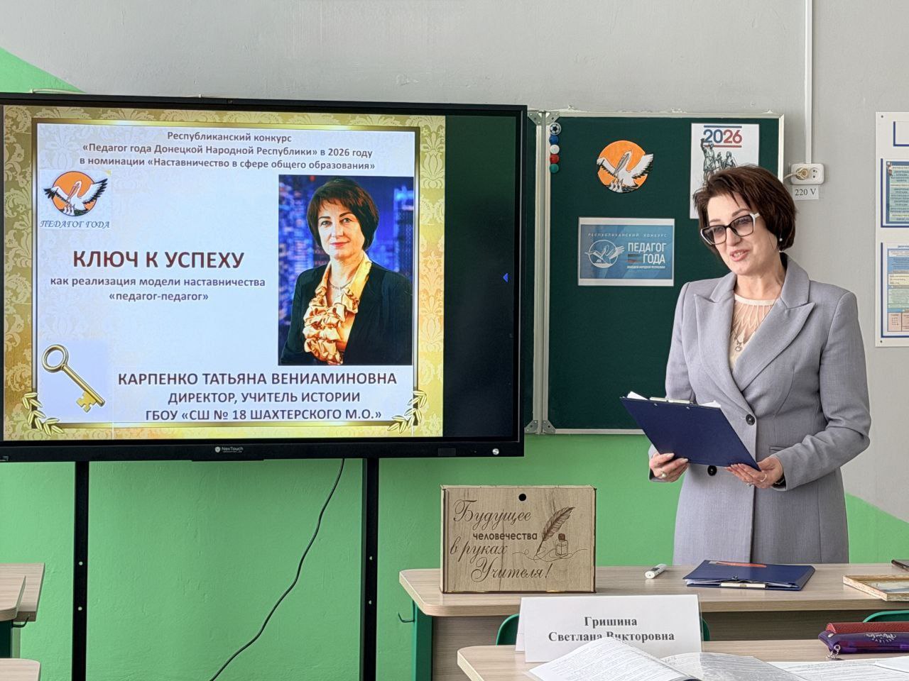 Завершился очный тур муниципального этапа Республиканского конкурса «Педагог года Донецкой Народной Республики» в 2026 году в номинации «Наставник молодых педагогов» (направление «Наставничество в сфере общего образования»), организованный Территориальным методическим центром Шахтерского муниципального округа Республиканской методической службы.
