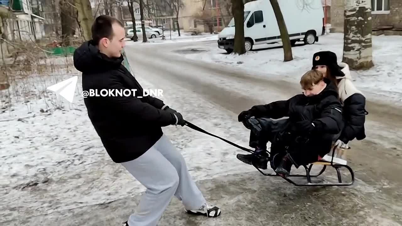В Ясиноватой молодежь радуется гололеду, катаясь на санках: папа тоже будет доволен