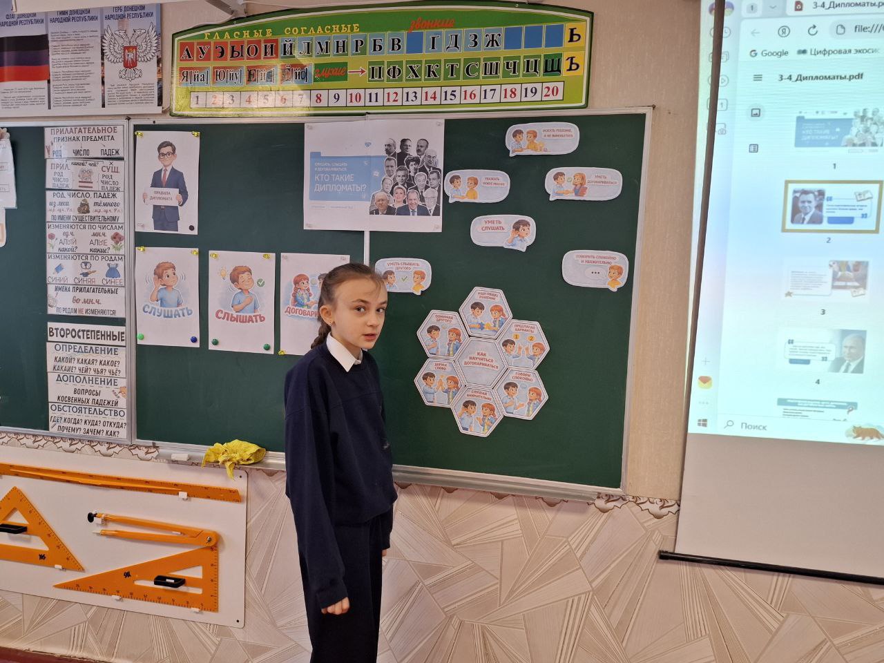 После линейки состоялось занятие в рамках федерального проекта «Разговоры о важном» на тему: «Слушать, слышать и договариваться. Кто такие дипломаты?». Занятие было приурочено ко Дню дипломатического работника, который отмечается 10 февраля.