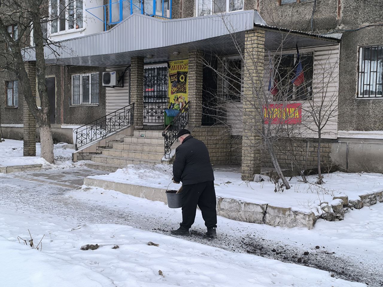 МБУ "Благоустройство" администрации города Тореза выполняют работы по посыпке тротуаров на территории городского округа Торез.