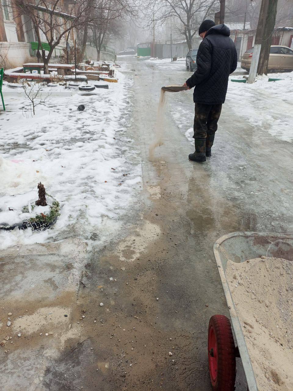 Организации, обслуживающие жилой фонд продолжают обработку территории вокруг своих объектов, посыпая тропинки и дорожки.