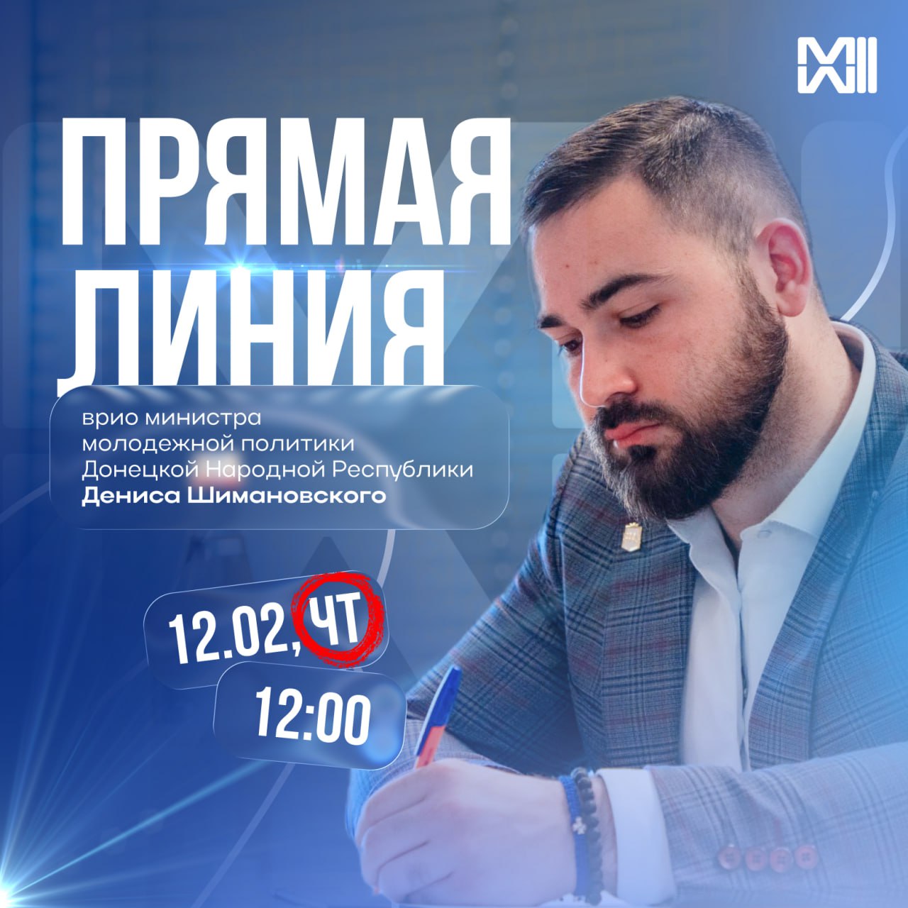 12 февраля в 12:00 врио министра молодежной политики ДНР Денис Шимановский проведет первую в этом году Прямую линию.