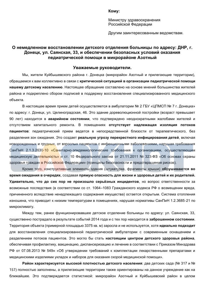 Жители микрорайона Азотный в Куйбышевском районе Донецка просят власти восстановить отделение детской педиатрии на улице Саянской, 33.