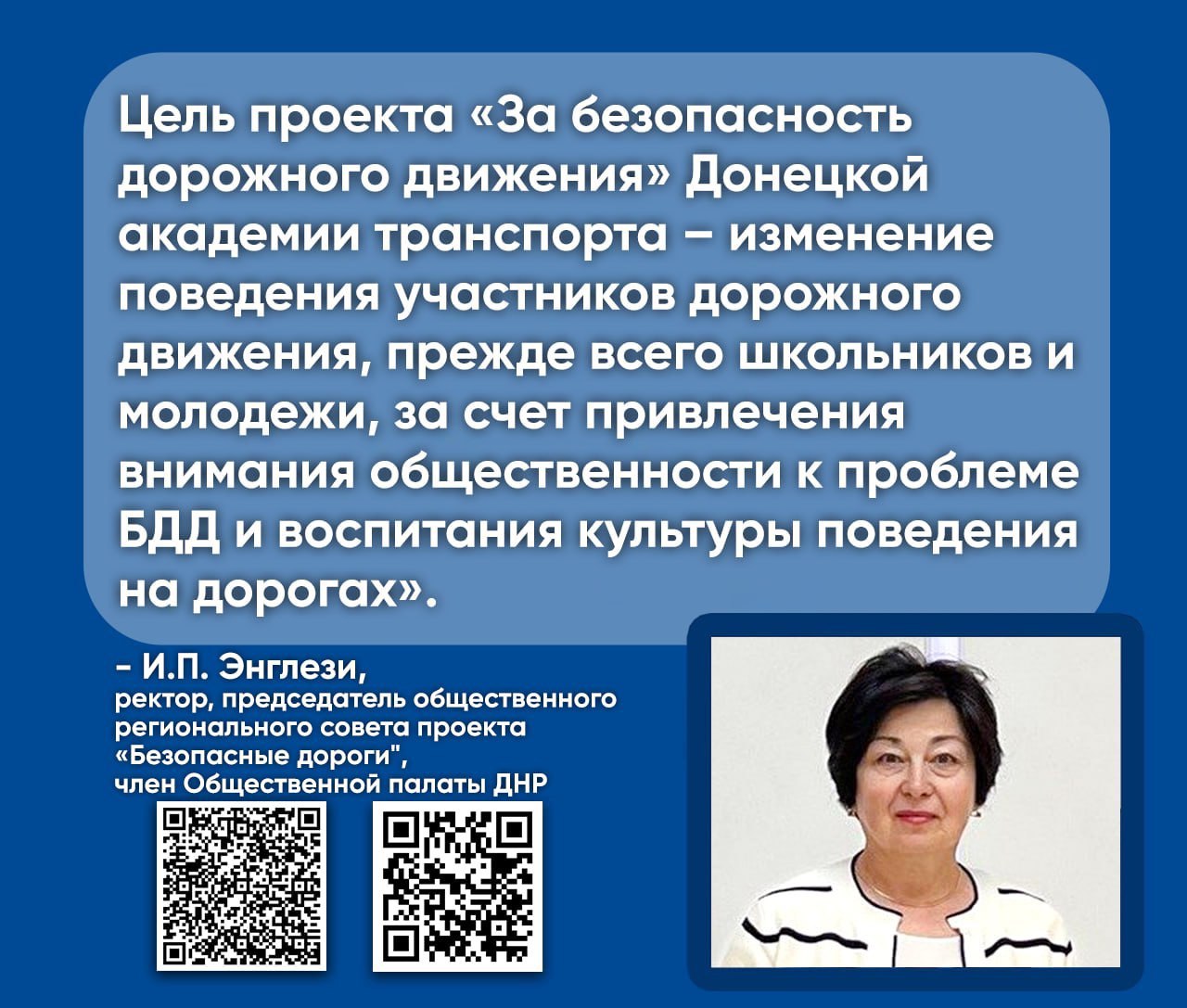 Ректор Донецкой академии транспорта Ирина Павловна Энглези, председатель общественного регионального совета проекта «Безопасные дороги» в Донецкой Народной Республике, 13 февраля 2026 г. приняла участие в Совещании региональных координаторов и председателей общественных советов в субъектах Российской Федерации федерального партийного проекта «Безопасные дороги» партии «ЕДИНАЯ РОССИЯ».