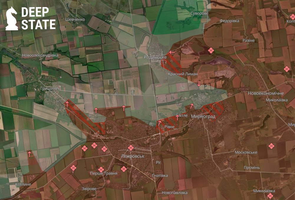 Как сообщают украинские "эксперты", Мирноград окончательно поглощается ВС РФ, а в северной части Покровска уже фиксируются точки взлета БПЛА. Одновременно с этим российская армия проникает в Гришино с северо-западных окраин Покровска.