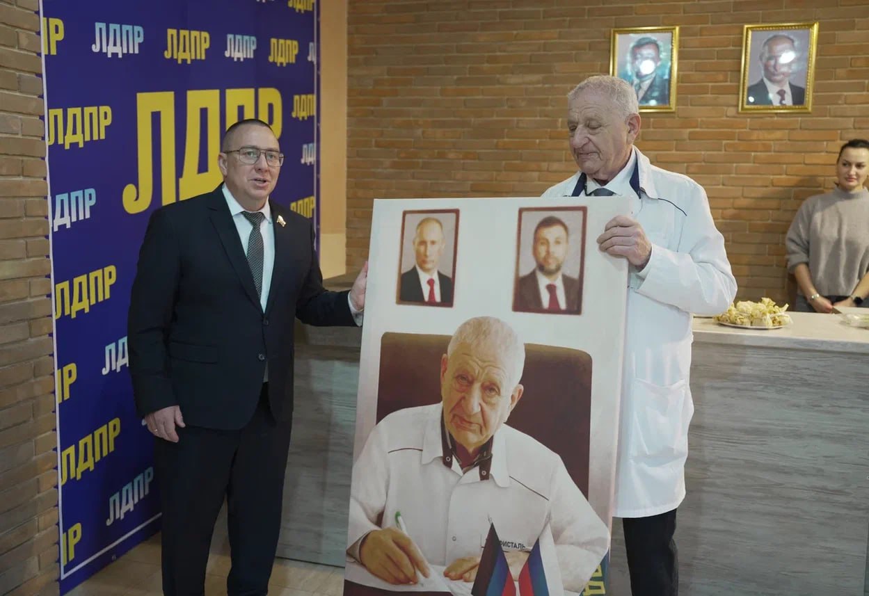 А начался день очень по-доброму, тепло и с искренней улыбкой на лицах. В штаб-квартире Донецкого городского отделения ЛДПР мы собрались, чтобы поздравить с днем рождения нашего легендарного Эмиля Яковлевича Фисталя.