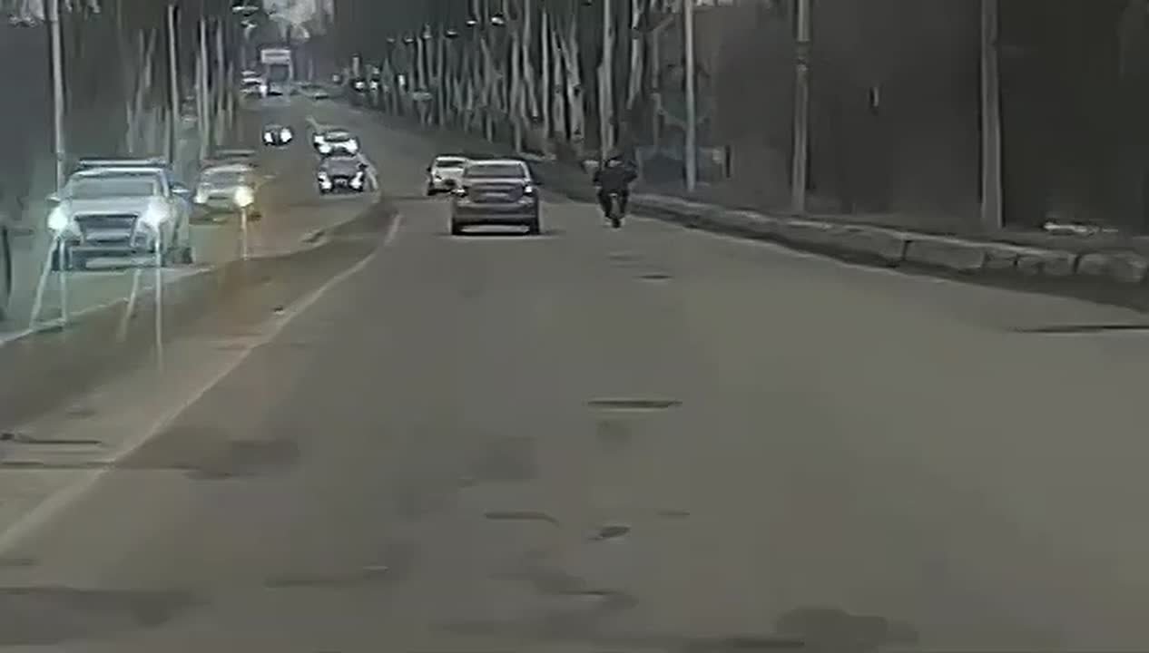 После удара пилот байка кубарем вылетел на дорогу. Повезло, что очевидец успел затормозить.