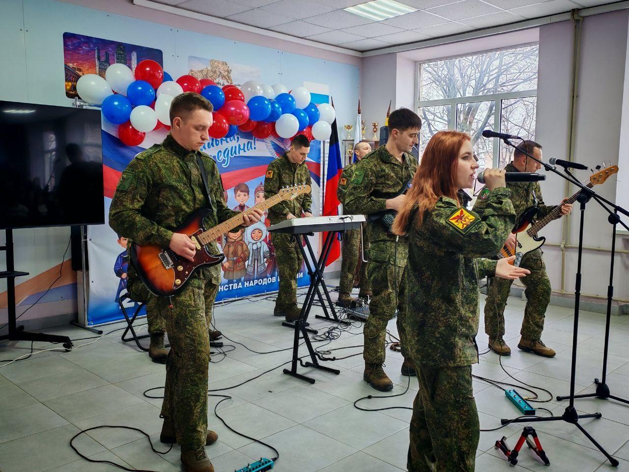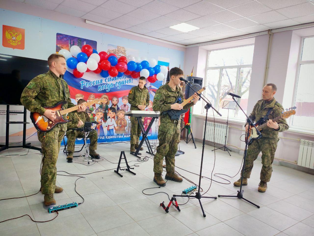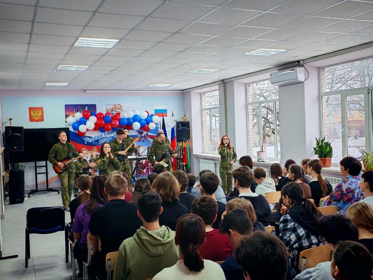 19 февраля ансамбль выступил для учащихся Осыковской школы. В теплой и душевной обстановке артисты исполнили патриотические песни, которые нашли искренний отклик у юных зрителей. А накануне праздника, в преддверии 23 февраля, музыканты приехали в Старобешевскую школу №1. Для учеников и педагогов встреча с профессиональными артистами в военной форме стала особенным событием.