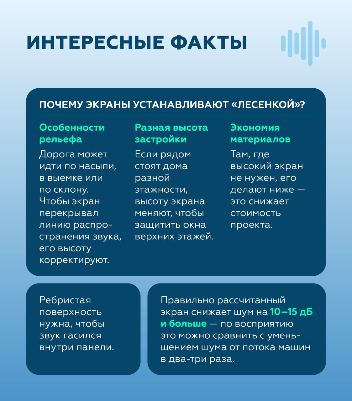 Их можно заметить на федеральных дорогах рядом с жилой застройкой, социальными объектами или зонами отдыха. Задача экранов — снизить уровень транспортного шума и обеспечить санитарно-эпидемиологическую безопасность прилегающих территорий.