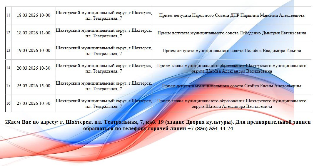 График приемов граждан в местной общественной приемной Шахтерского местного отделения партии «ЕДИНАЯ РОССИЯ» в марте 2026 года