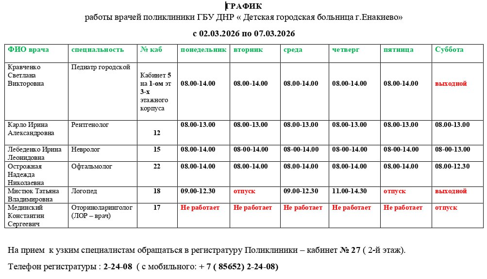 График приемов врачей в Городском противотуберкулезном диспансере г. Енакиево с 03.03.2026 по 07.03.2026.