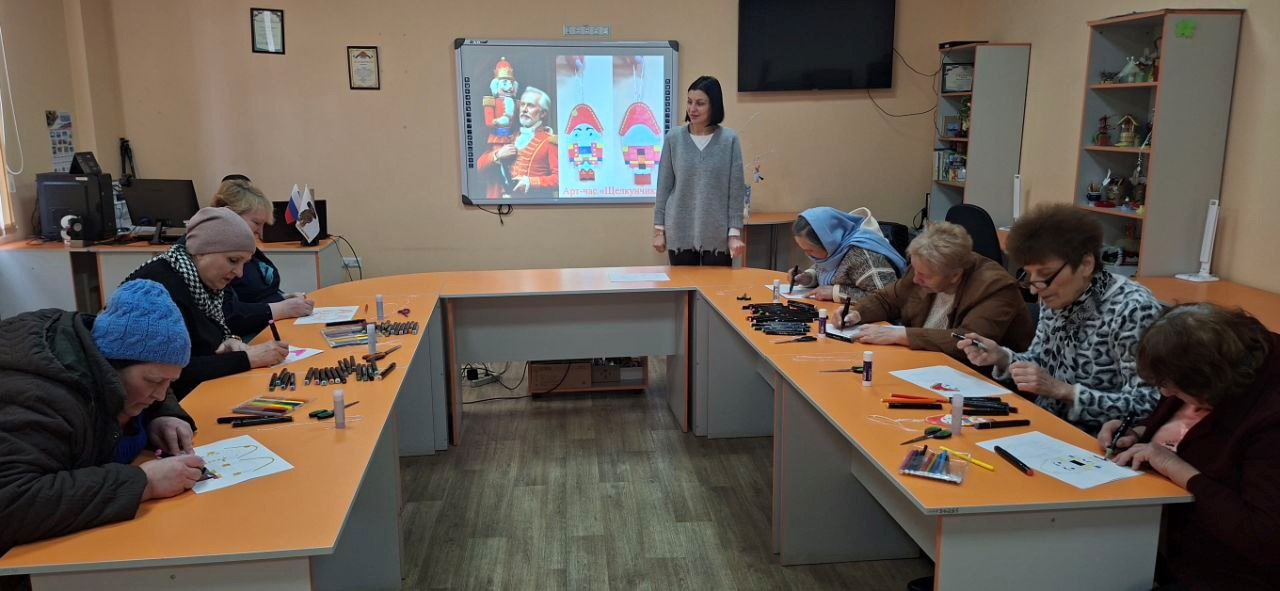 Молодёжный отдел МБУ «Мироновский поселковый ДК» провёл для женского клуба «НАТАЛИ» Арт-час «Щелкунчик». Присутствующие с удовольствием разрисовали шаблон игрушки, а затем изготовили поделку. Такие встречи приносят большую пользу. Рисование положительно влияет на моторику пожилых людей через развитие координации движений. Занятия рисованием способствуют улучшению эмоционального состояния и повышают самооценку пенсионеров.