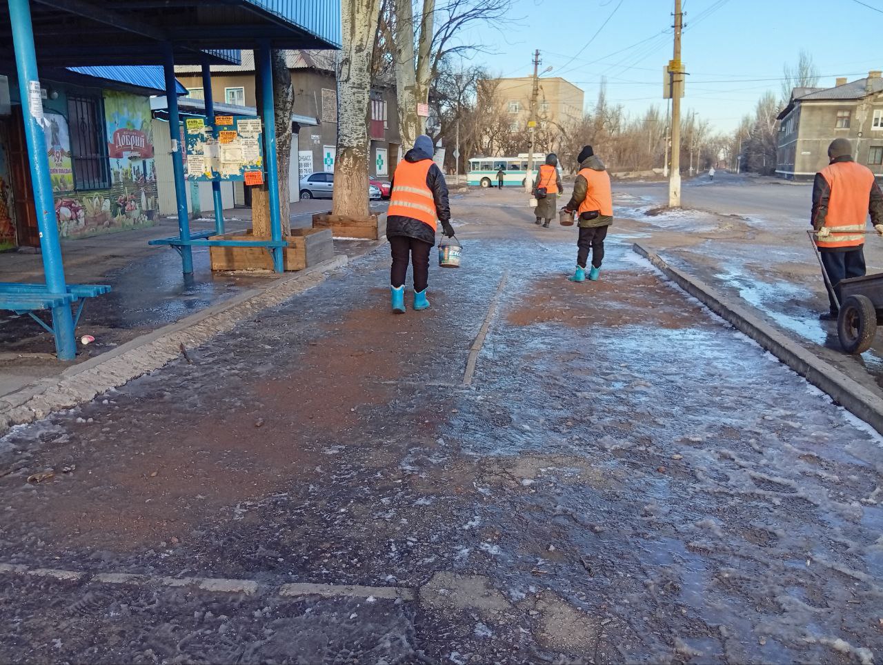 - посыпка противогололёдными смесями тротуаров, внутриквартальных проездов, террриторий возле остановок общественного транспорта, подходов к жилым домам и ступеней;