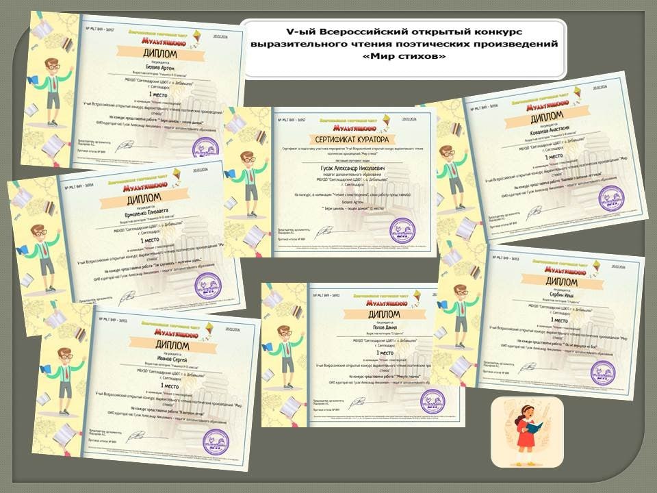 Учащиеся Театра-студии «Откровение» Светлодарского ЦДЮТ приняли участие в V Всероссийском открытом конкурсе выразительного чтения поэтических произведений «Мир стихов». Все участники заняли первые места!
