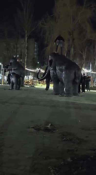 Макеевчане пытаются оседлать мамонтов, которые установили Югорчане в обновлённом парке