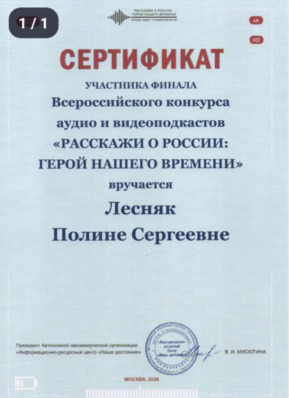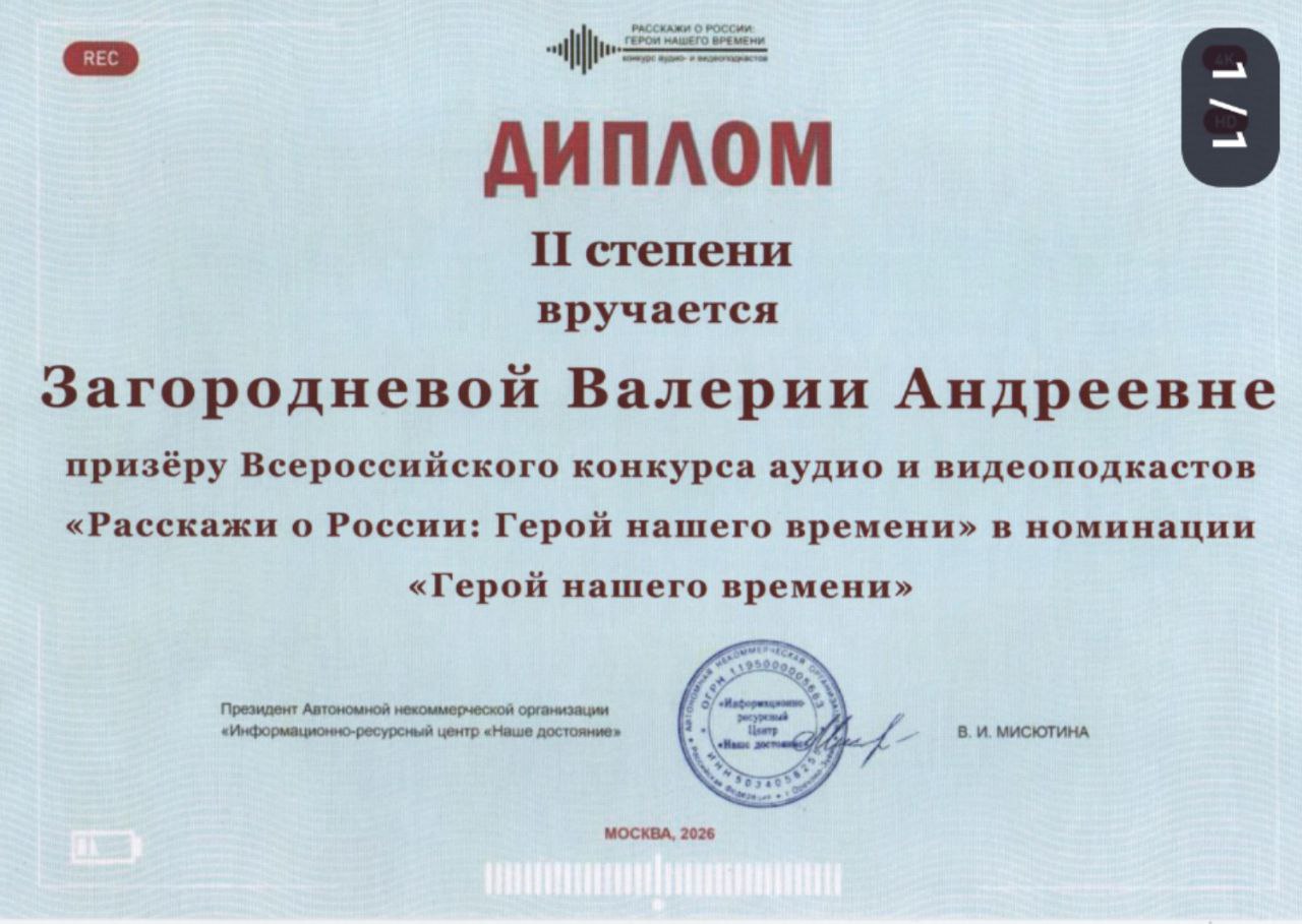 С 26по28февраля 2026года в Москве прошёл финал конкурса аудио и видеоподкастов «Расскажи о России: Герой нашего времени». Организатор — АНО «Информационноресурсный центр „Наше достояние“».