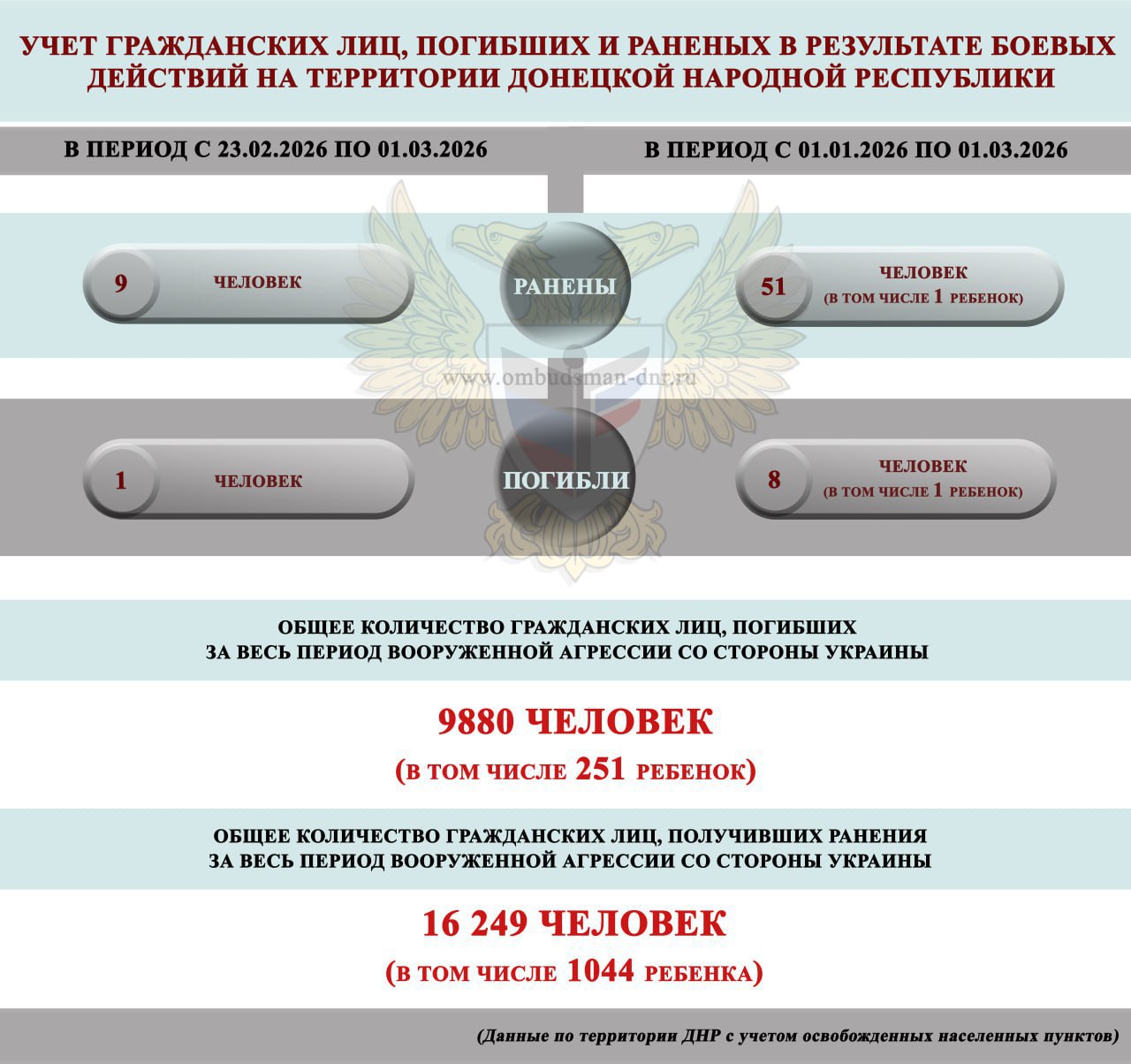 За прошедшую неделю с 23 февраля по 1 марта ДНР в результате обстрелов ВСУ погиб 1 мирный житель, ранения получили 9 мирных жителей.