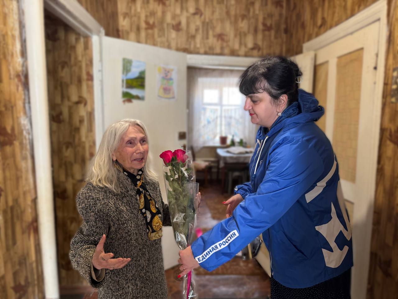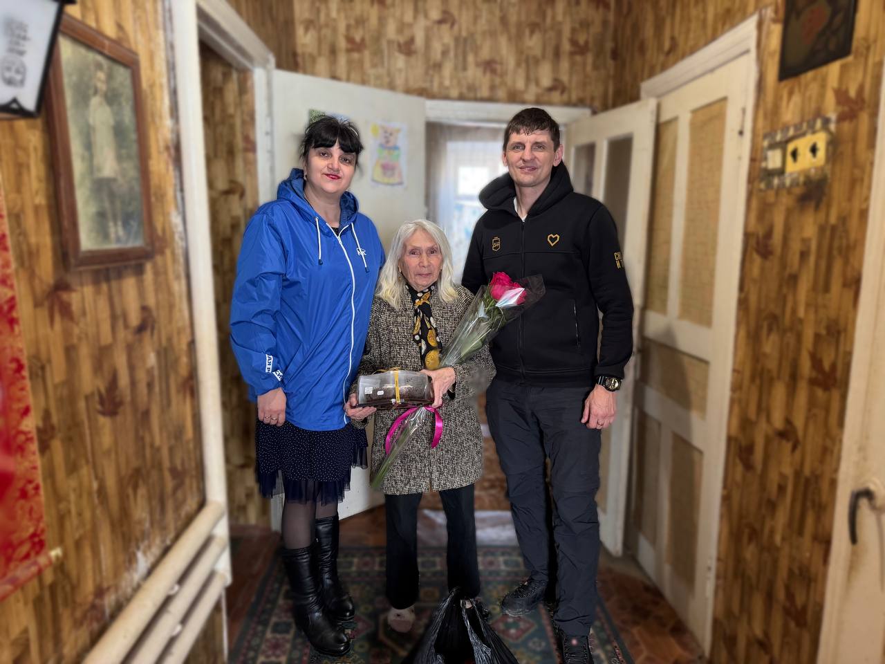 Миле Дмитриевне искренние пожелания крепкого здоровья, душевного тепла и благополучия. Также вручили ей цветы и подарки.