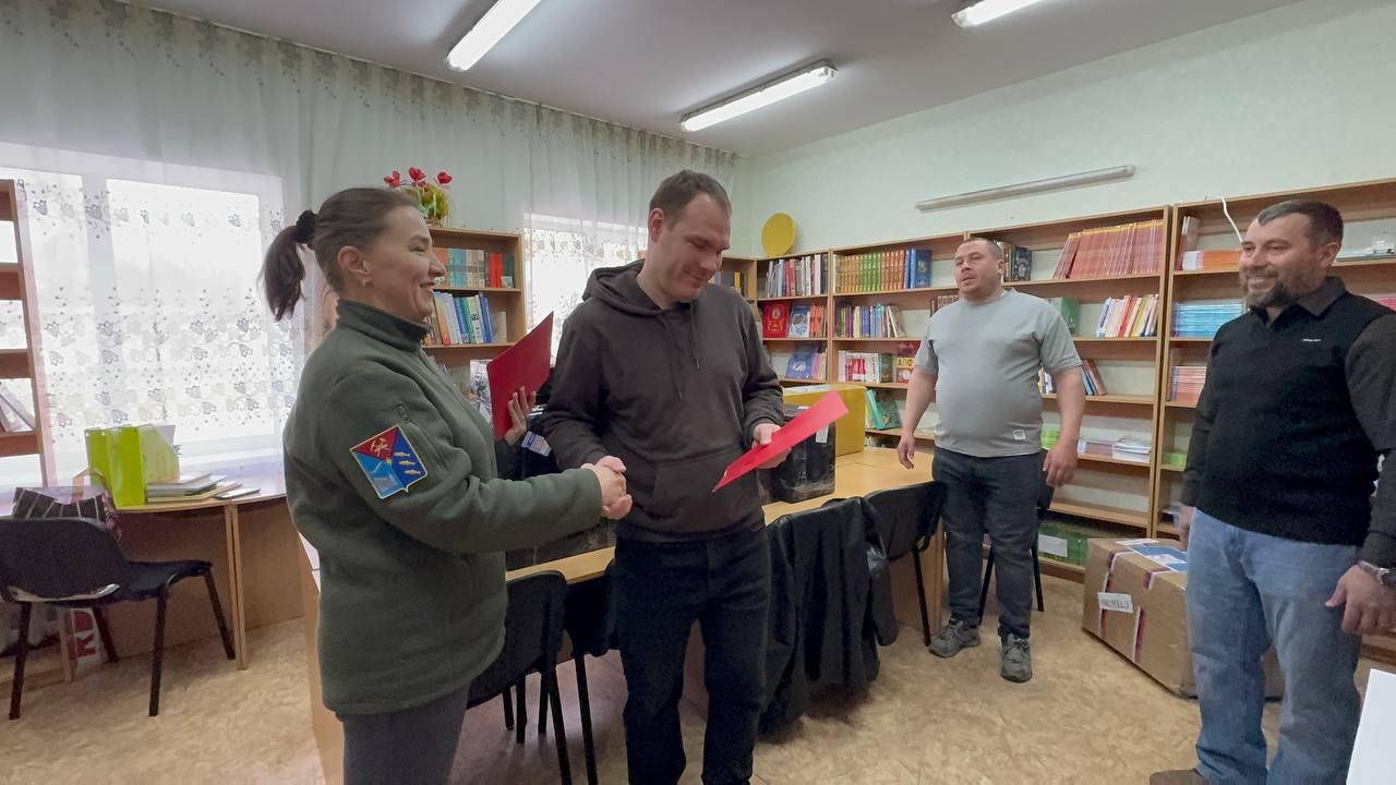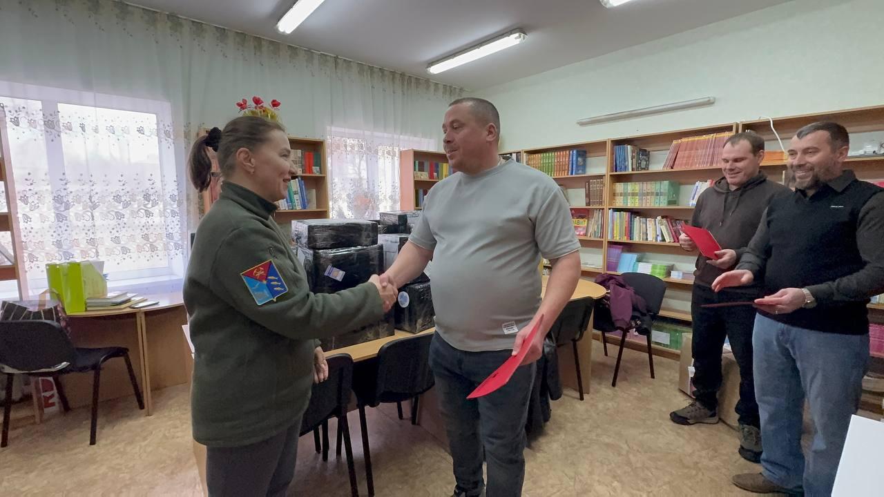 В честь прошедшего Дня рождения школы № 4 Ждановки депутат Магаданской городской Думы и волонтер СВО Юлия Домрина передала директору учреждения Лидии Соколовой презент от Английской гимназии Магадана.
