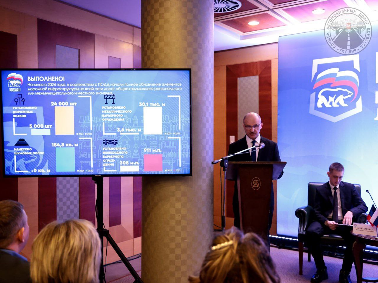 В 2024-2025 годах мы выполнили полную диагностику и паспортизацию сети дорог, разработку проектов организации дорожного движения на сети протяженностью 3461,9 км что составляет 100% от общей сети дорог. И в соответствии с ПОДД начали полное обновление технических средств организации дорожного движения. Только дорожных знаков в 2024-2025 годах установили порядка 30 тысяч.Особое внимание в 2025 году было уделено комплексному обустройству техническими средствами организации дорожного движения мест вблизи школ и пешеходных переходов, где в рамках поручения Главы региона Д. В. Пушилина были выполнены первоочередные мероприятия, направленные на устранение причин и условий совершения ДТП: на 29 таких объектах в малых населенных пунктах было установлено 35 новых светофоров и порядка 300 светильников наружного освещения.