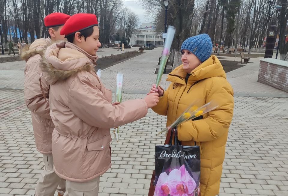 Юные патриоты вышли на центральные улицы города, чтобы от лица всего подрастающего поколения выразить глубокую признательность, любовь и уважение прекрасной половине человечества.