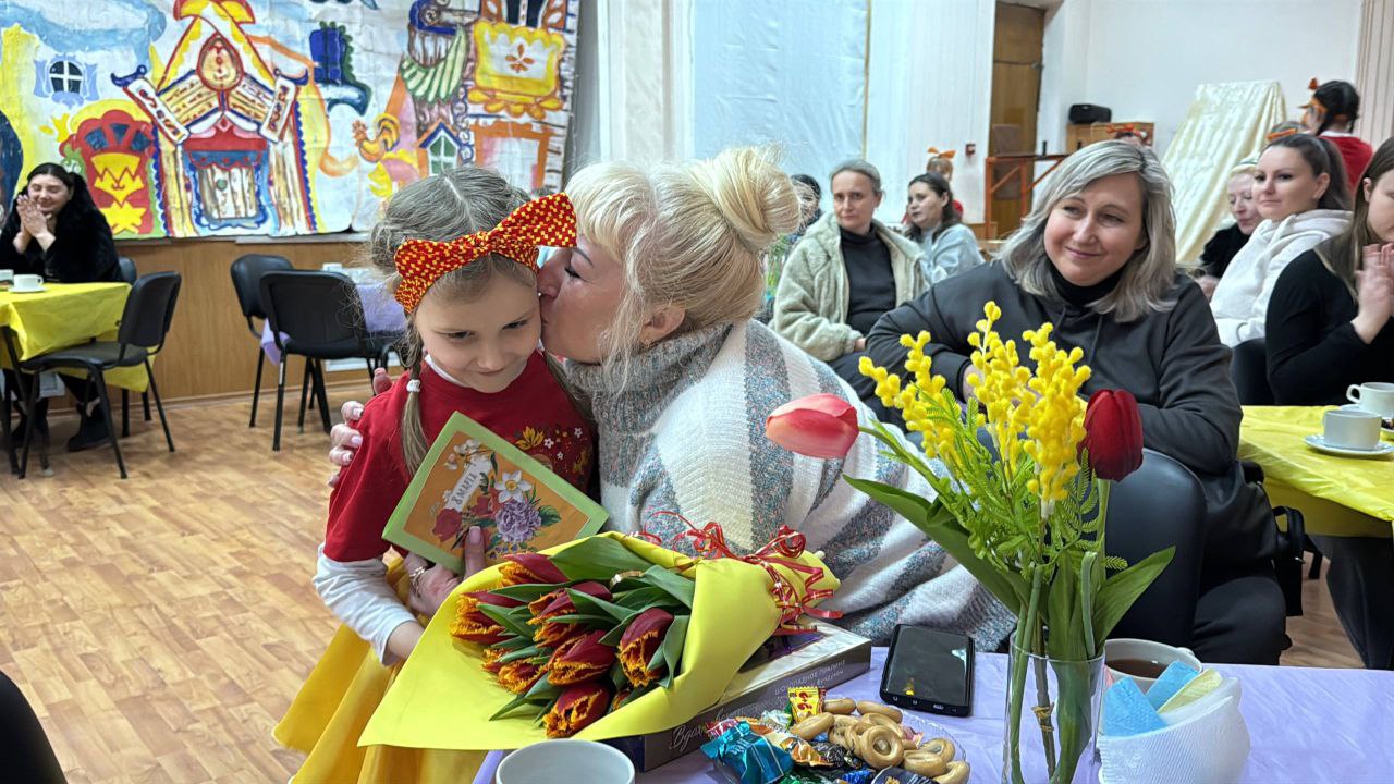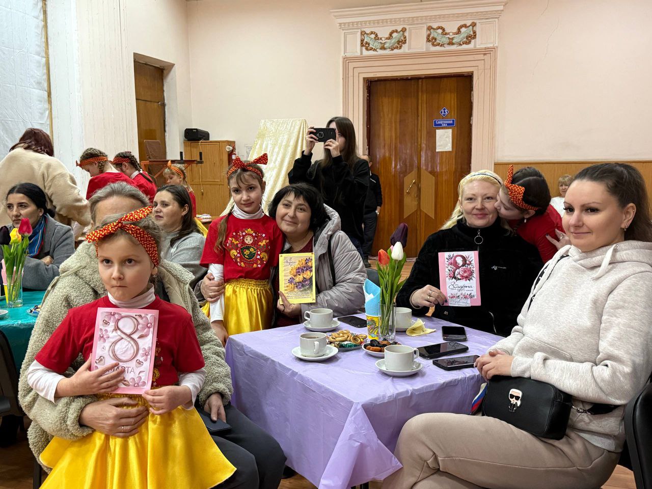 Одним из самых душевных моментов вечера стал мастер-класс для детей. Ребята прямо во время мероприятия с помощью цветной бумаги и клея мастерили поздравительные открытки для своих мам и бабушек и тут же, в зале, вручили их виновницам торжества.