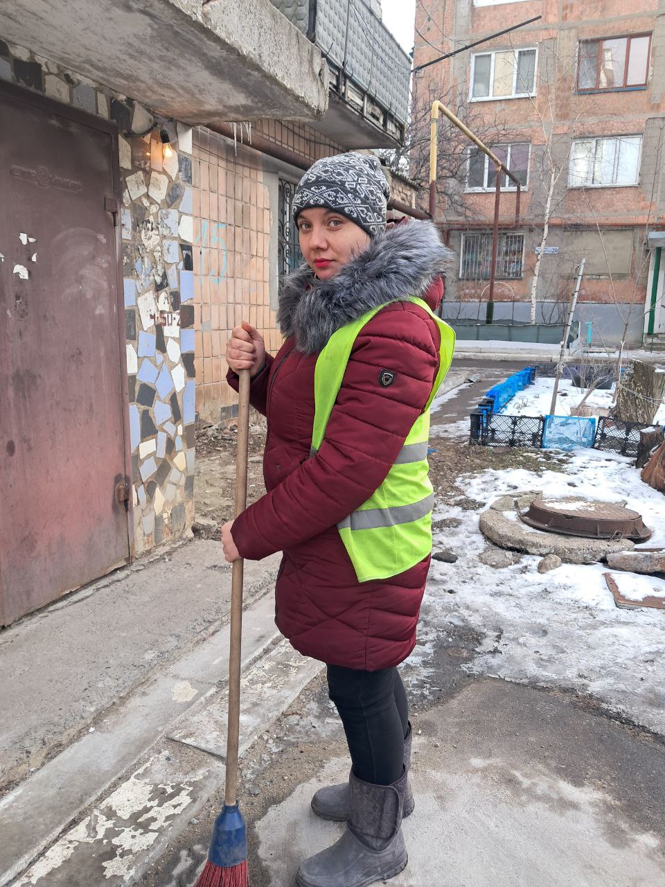 Бугаева Татьяна Григорьева, уборщик территории Шахтерского производственного участка Торезского филиала Единого Регионального Фонда управления многоквартирными домами Донецкой Народной Республики.